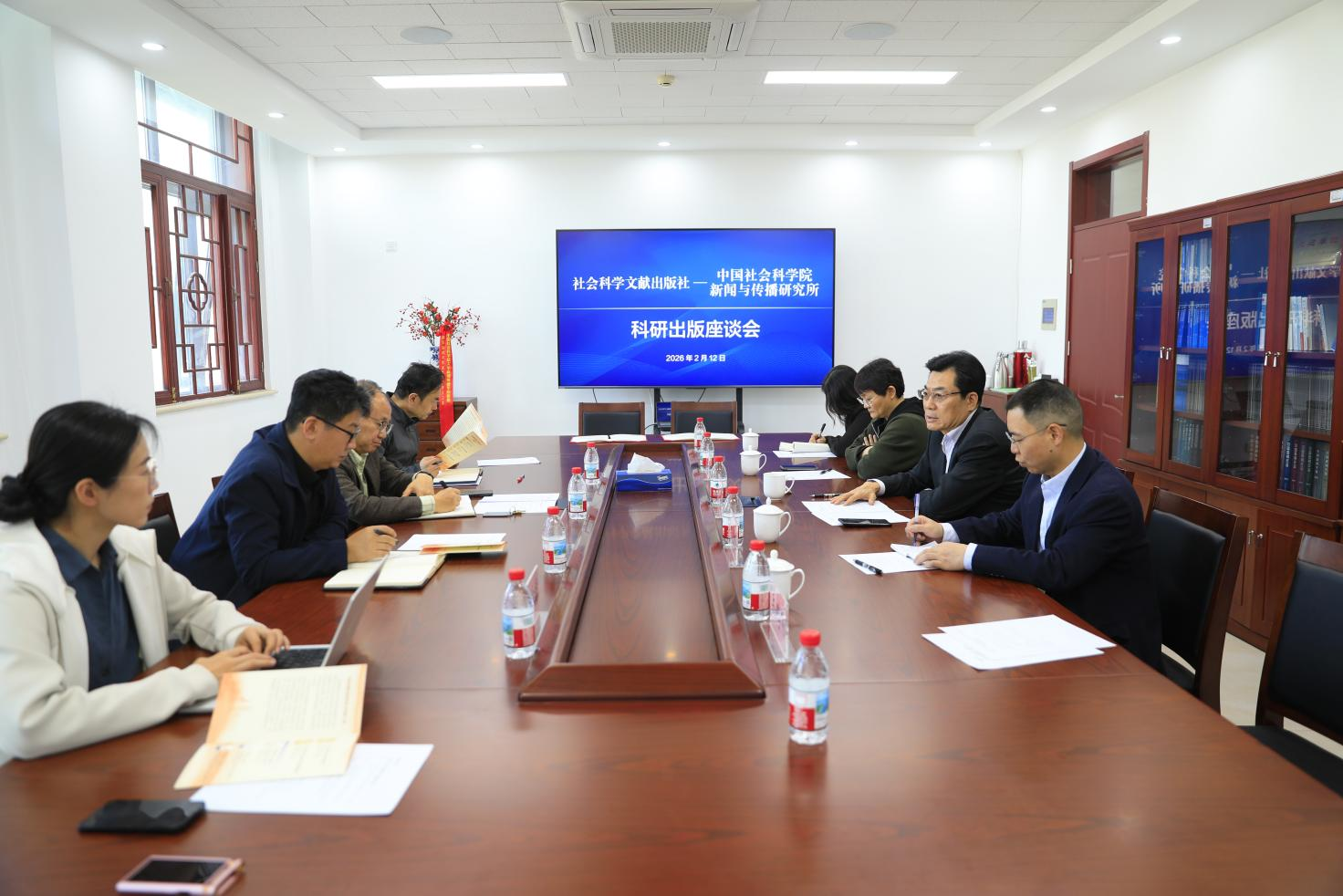 2026年2月12日,中国社会科学院新闻与传播研究所(以下简称“新闻所”)与社会科学文献出版社(以下简称“社科文献社”)在新闻所就科研出版合作共建事宜进行座谈交流。新闻所所长、党委副书记胡正荣,党委副书记(主持党委工作)范承志,科研处处长刘瑞生、青年学者代表张喆喆博士,社科文献社党委书记、社长冀祥德,文化传媒分社社长祝得彬,国际出版分社社长李延玲,重点项目办公室常务副主任兼中国式现代化研究丛书出版工程办公室副主任孙美子,行政安保部行政主管岳鹏飞参加座谈。会议由新闻所党委副书记(主持党委工作)范承志主持。